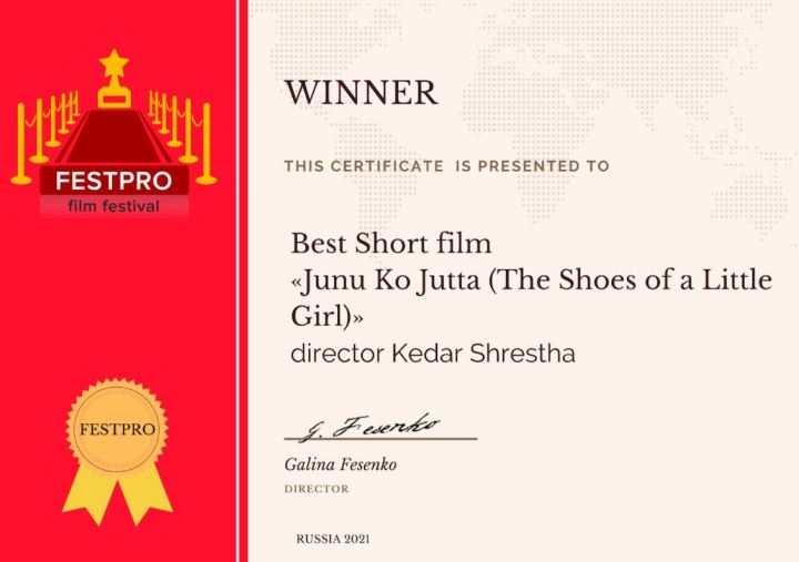काठमाडौं । नेपाली सर्ट फिल्म ‘जुनुको जुत्ता (द सुज अफ अ लिटल गर्ल)’ले अर्को अन्तर्राष्ट्रिय अवार्ड जितेको छ । केदार श्रेष्ठ निर्देशित फिल्मले रुसको फेस्टप्रो फिल्म फेस्टिभलमा बेस्ट सर्ट फिल्मको अवार्ड जितेको हो ।