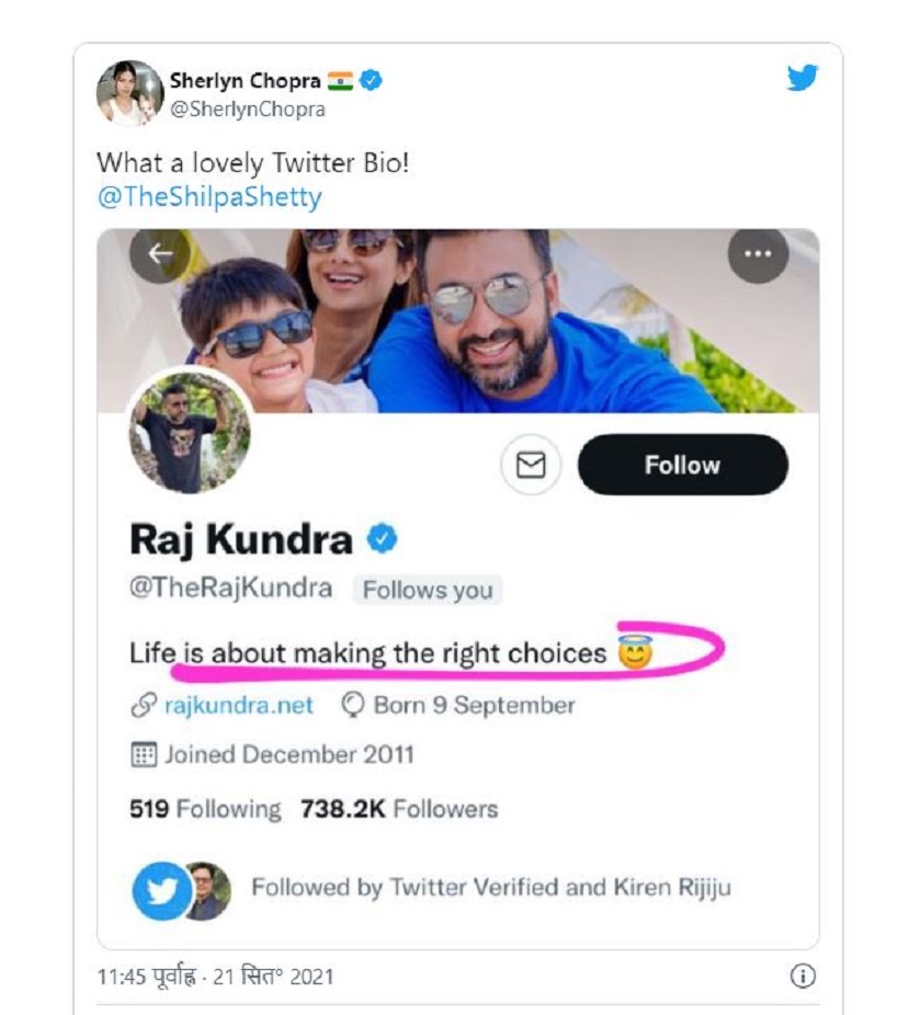 अभिनेत्री तथा मोडल शर्लिन चोपडाले आफ्नो ट्वीटर अकाउन्टमा राज कुन्द्राको ट्विटर बायो सेयर गर्दै राज कुन्द्रामाथि कडा टप्पणी गरेकी हुन् । अभिनेत्री शर्लिनले सेयर गरेकी राज कुन्द्राको ट्वीटर बायोमा लेखिएको छ, ‘जीवन पथको सही छनौट हो ।’
