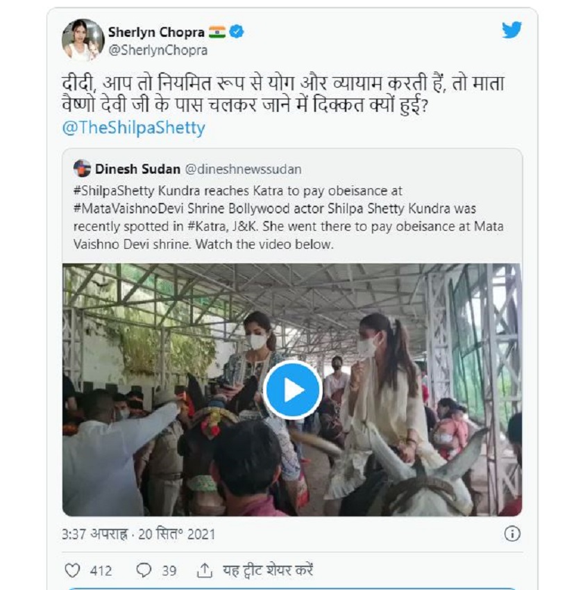 यसैबीच शिल्पा शेट्टीको भिडियो शेयर गर्दै शर्लिन चोपडाले लेखेकी छन्, ‘दिदी, तपाई नियमित योग र व्यायाम गर्नुहुन्छ । त्यसैले माता वैष्णो देवीको पैदल यात्रामा किन समस्या भयो ।’ उक्त भिडियोे शिल्पा शेट्टीको वैष्णो देवीको यात्राको हो ।