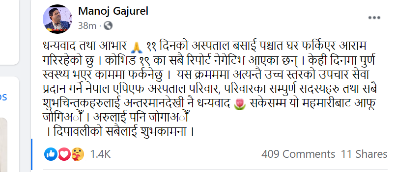 गजुरेल ११ दिनपछि अस्पतालबाट घर फर्किएका हुन् । उनले आफ्नो फेसबुक पेजमा आइतबार बिहानै लेखेका छन्, ‘११ दिनको अस्पताल बसाईपश्चात् घर फर्किएर आराम गरिरहेको छ । कोभिड १९ का सबै रिपोर्ट नेगेटिभ आएका छन् । केही दिनमा पूर्ण स्वस्थ भएर काममा फर्कनेछु । ’