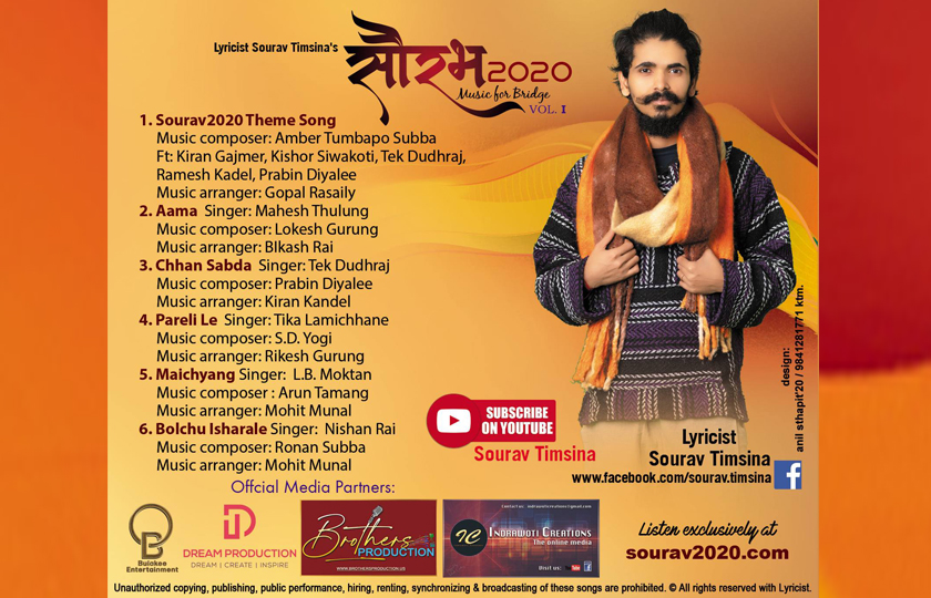 सम्पुर्ण गीतहरु गीतकार तिम्सिनाको वेवसाइट सौरव २०२० र अन्य थुप्रै डिजिटल प्ल्याटफर्म बाट सुन्न सकिनेछ । किरण गजमेर, किशोर सिवाकोटी, टेक दुधराज, रमेश कडेल, प्रविन दियाली, महेश थुलुङ, टिका लामिछाने, एल बी मोक्तान, निशान राईले बिभिन्न गीतमा आफ्नो आवाज दिएका छन् ।